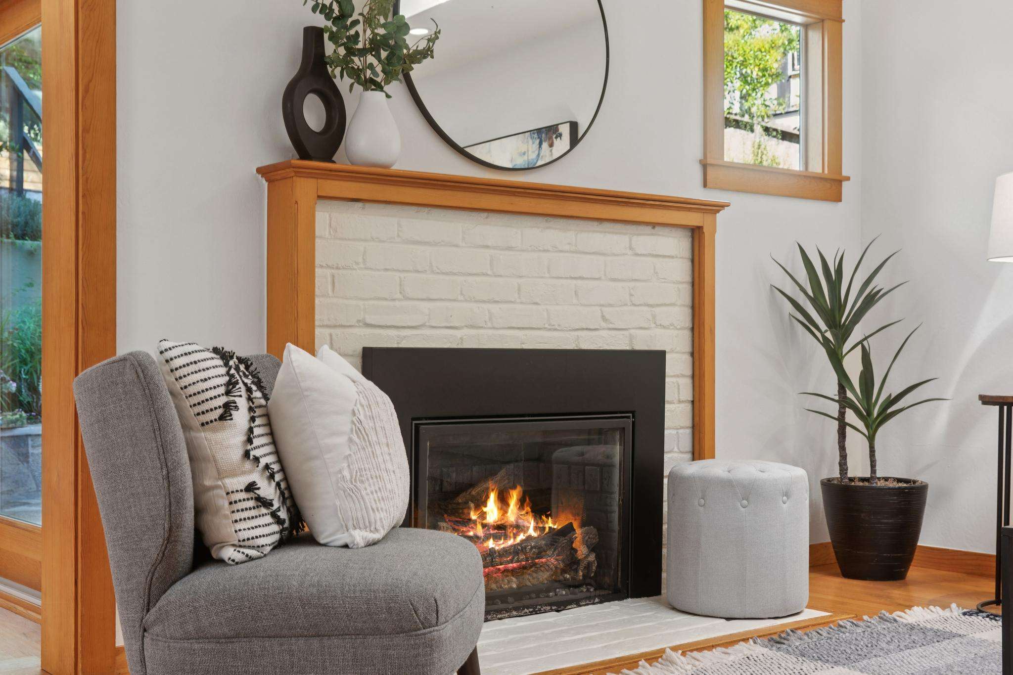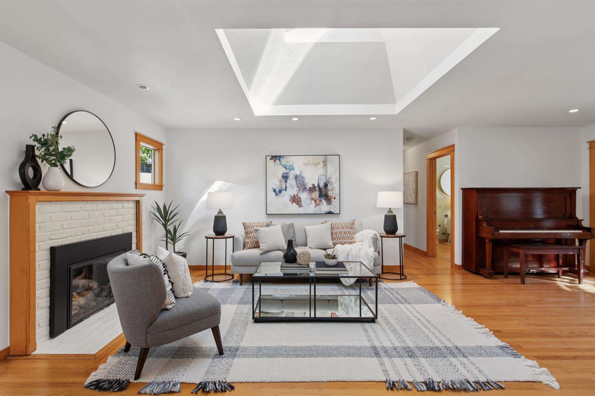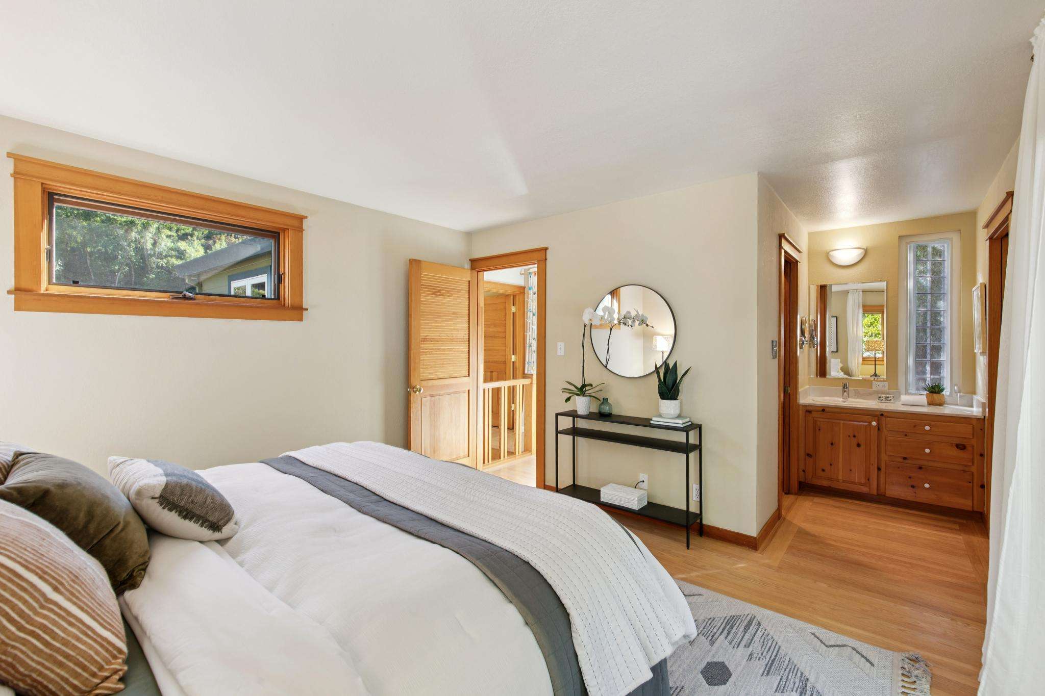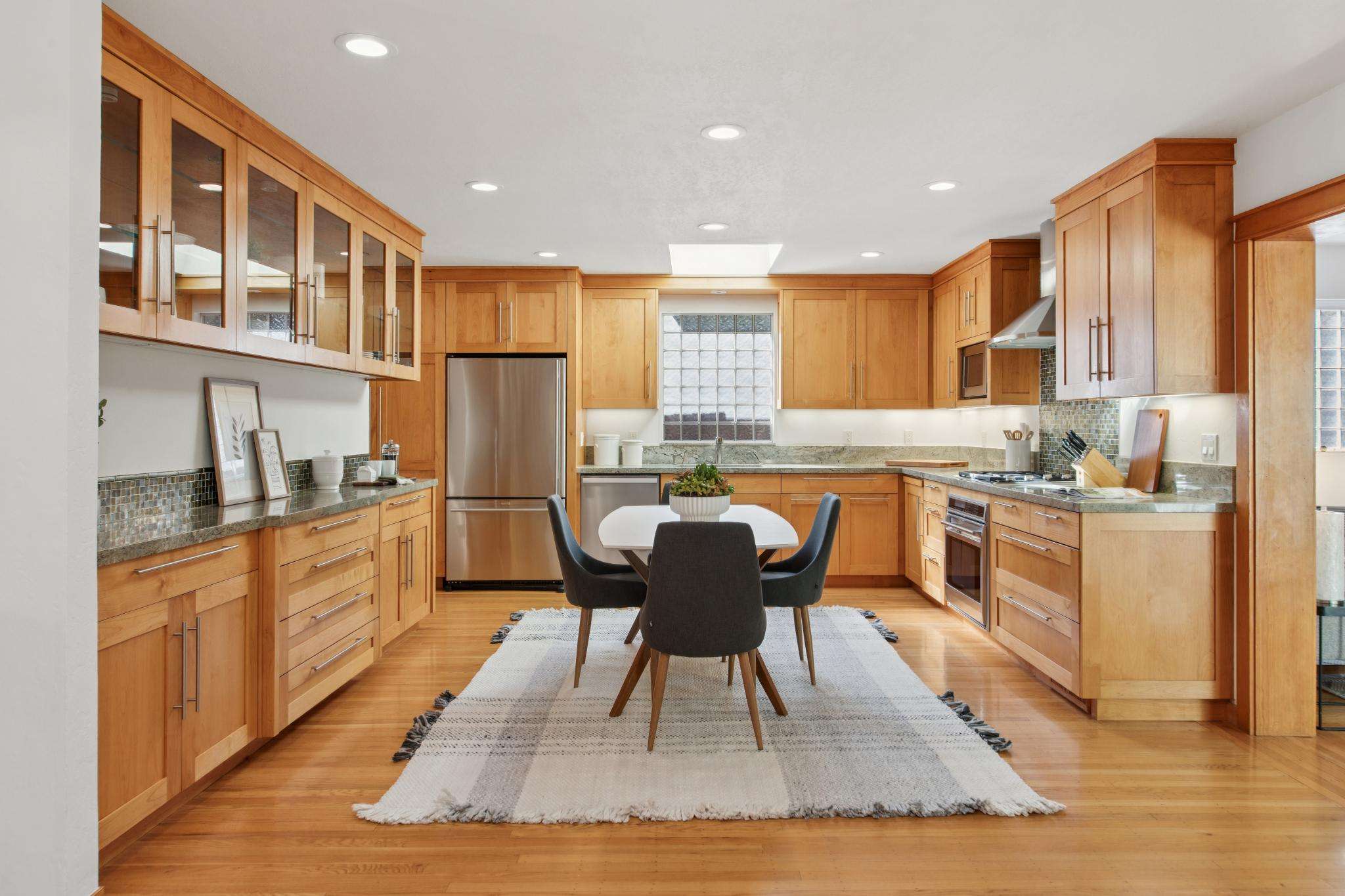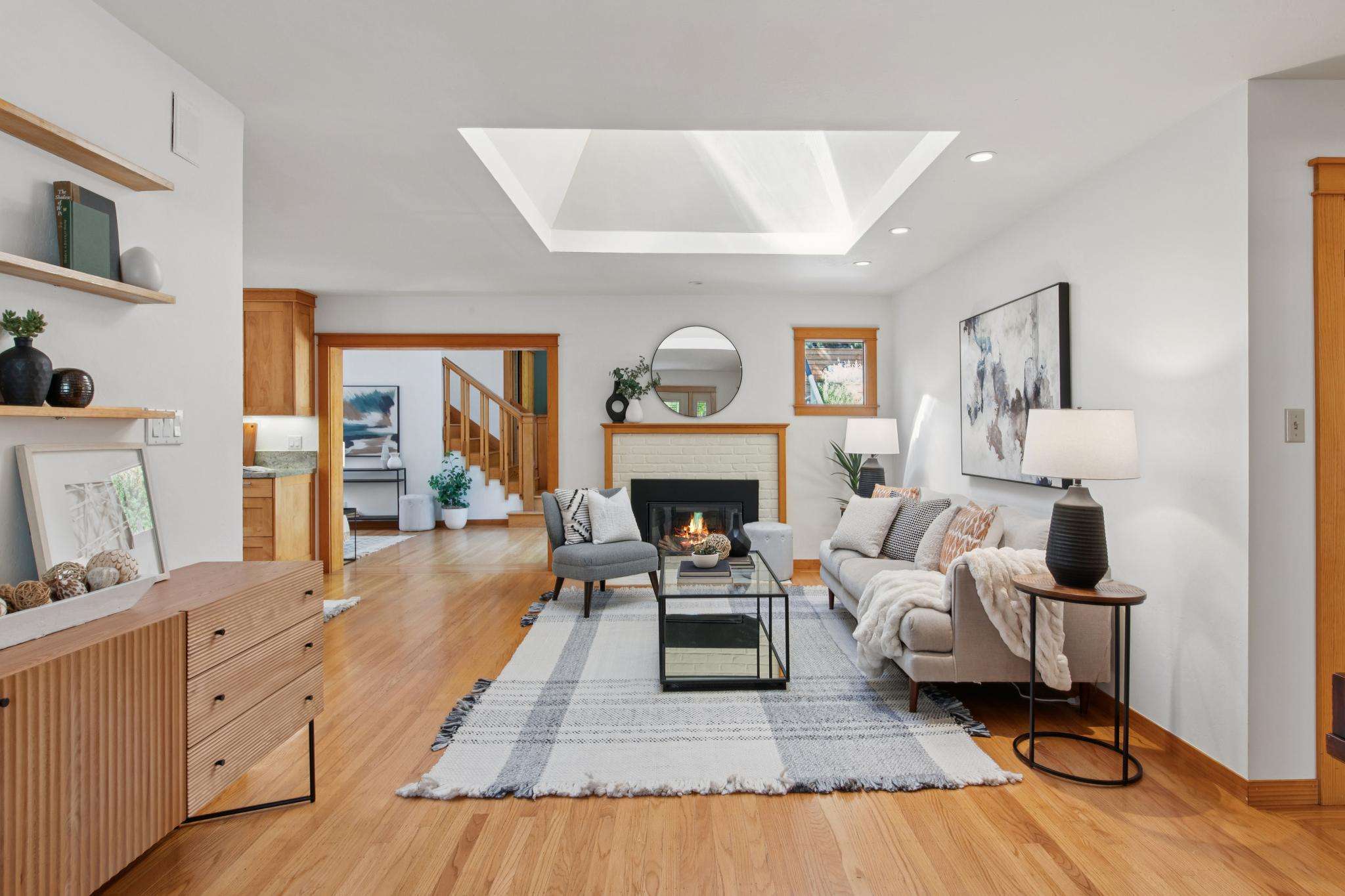 Over the years, the home has been transformed with care by a respected local architect and contractors, balancing modern comfort with original charm. At its heart, the open-plan kitchen, dining, and living room flow seamlessly together, filled with natural light from skylights, dual-pane windows, and sliding glass doors. Oak floors and clean, thoughtful design evoke a subtle Northern European vibe — warm, welcoming, and timeless — creating an inviting environment for cooking, conversation, and connection.