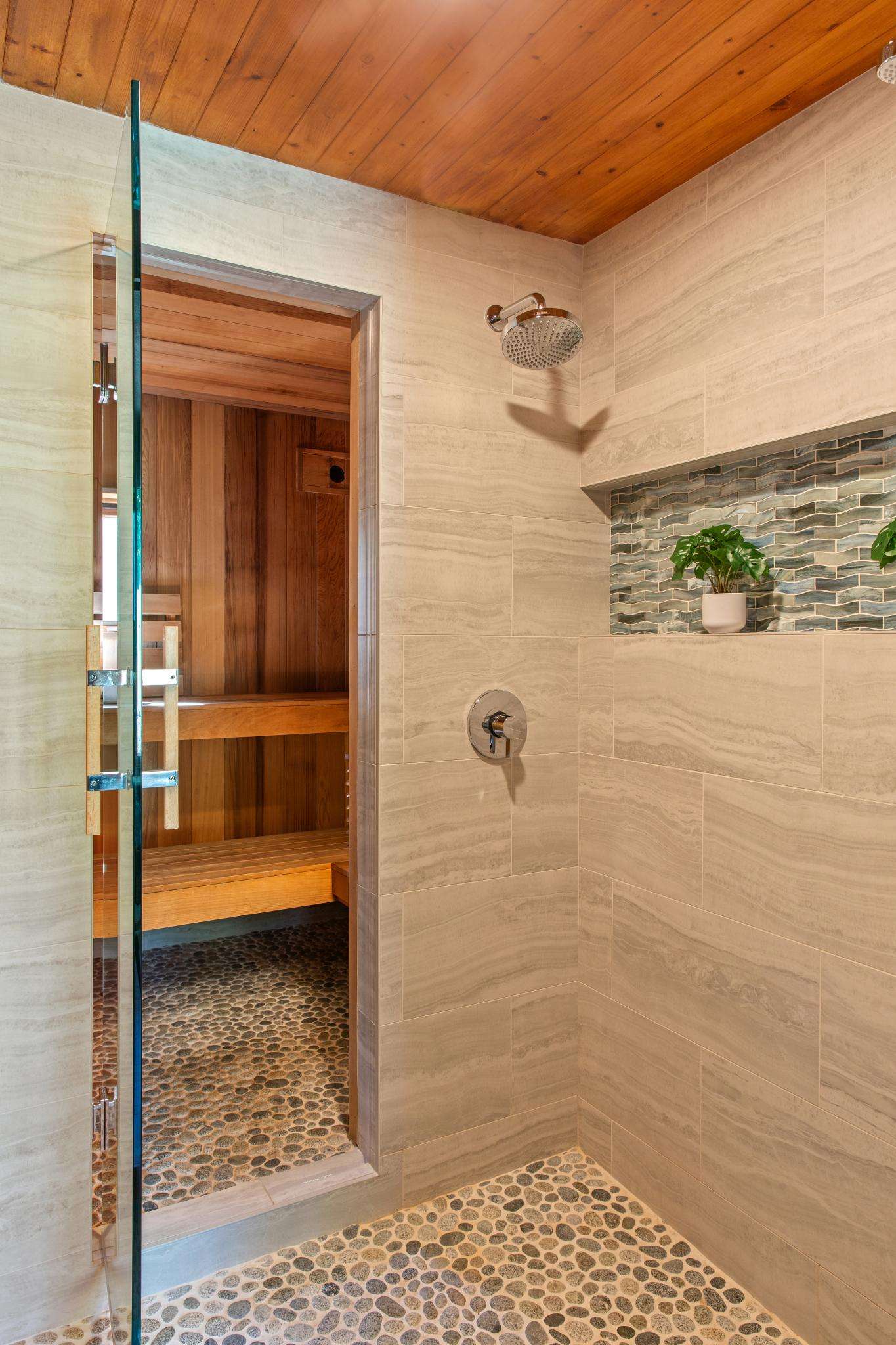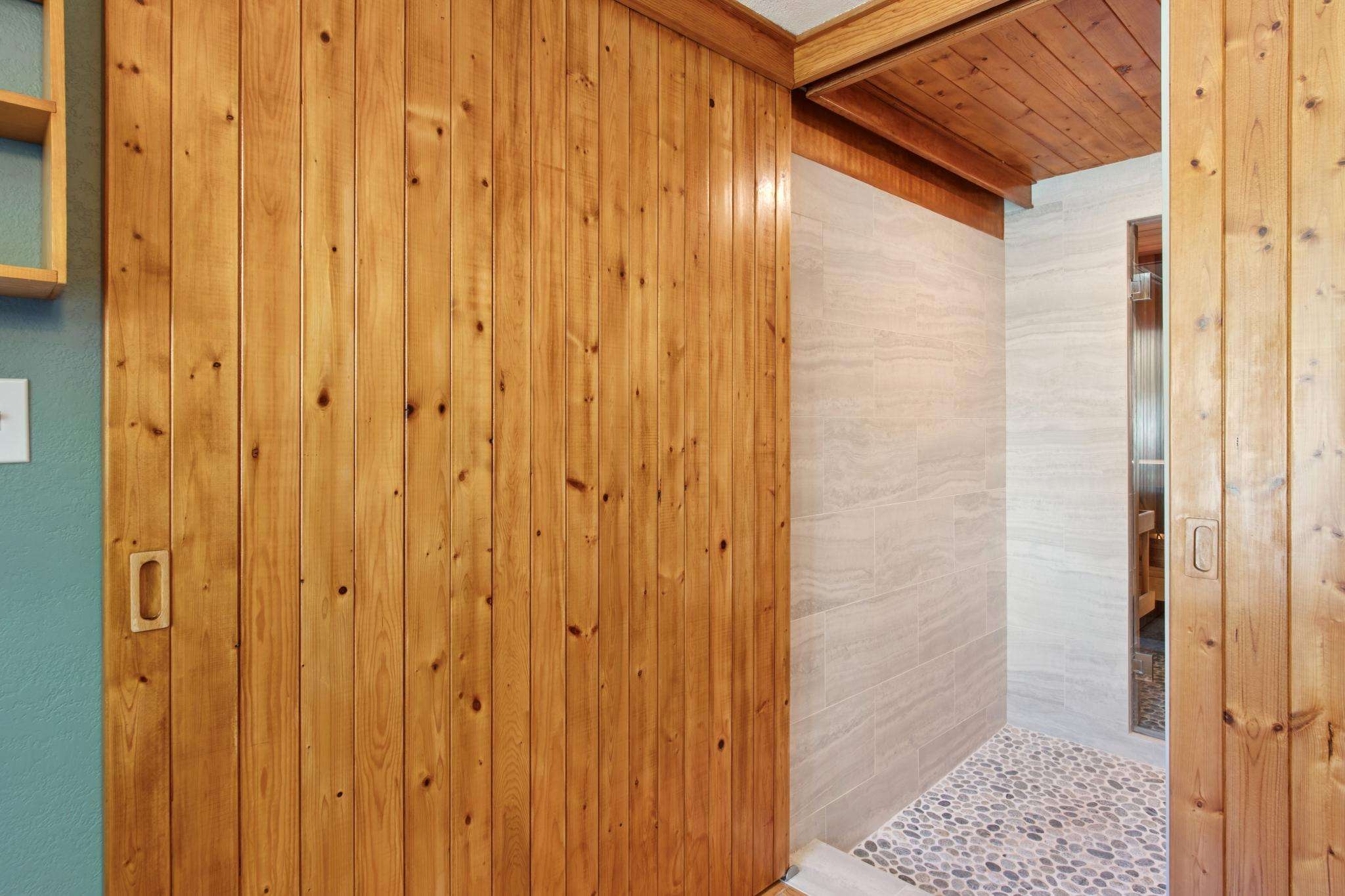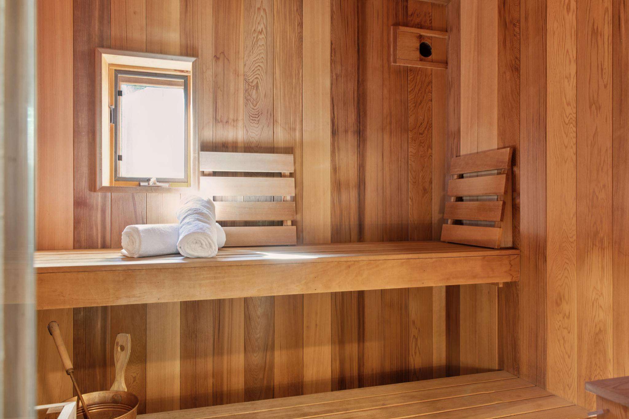 Downstairs are three generously sized bedrooms and a bathroom, while upstairs additional bedrooms and bathroom add flexibility for family and guests. Unique touches bring a sense of retreat: a sauna with pebble-floored shower, a cozy bonus space perfect for reading or yoga, and smartly placed patios and terraces that invite you outdoors for dining and relaxation.