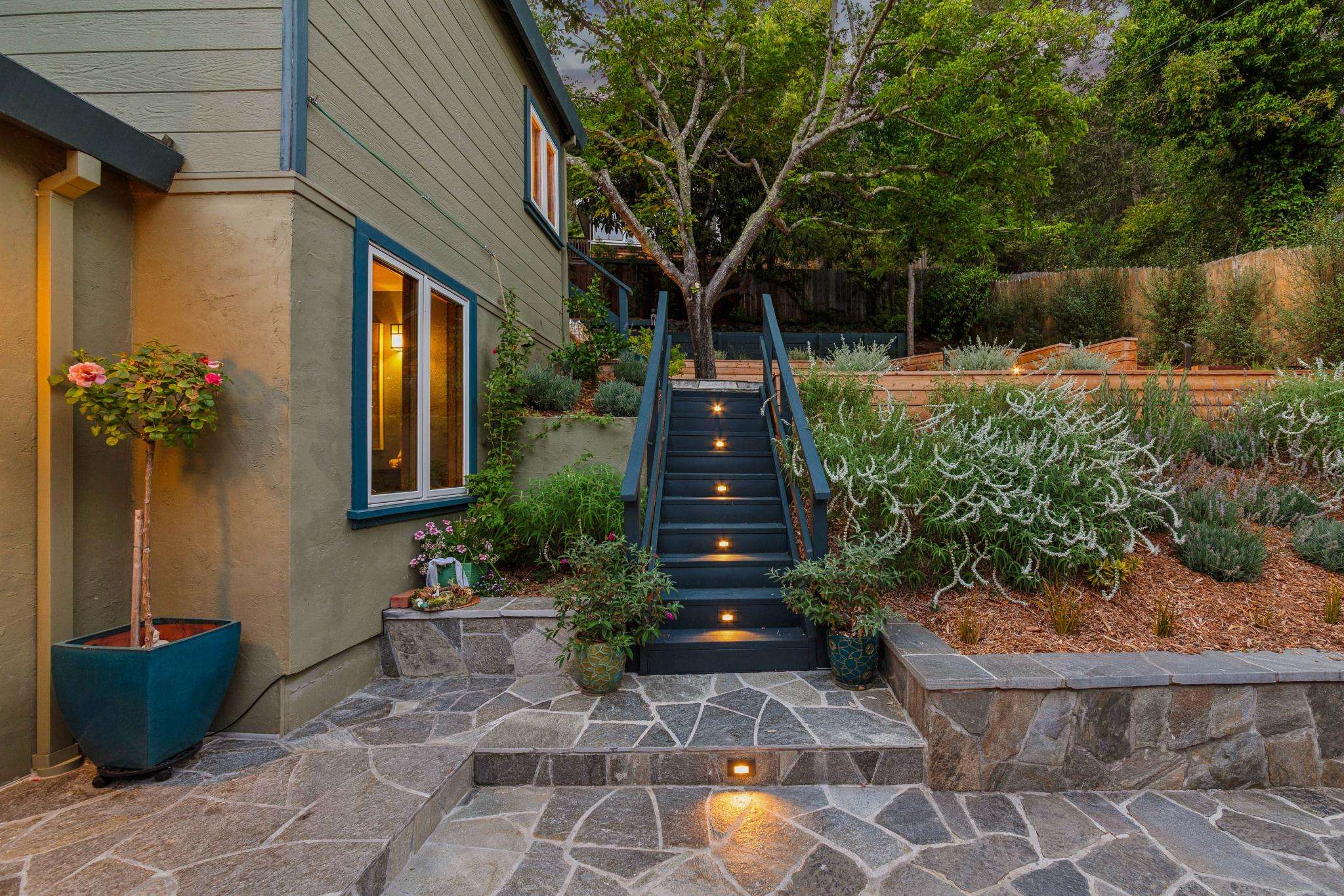 The outdoors have been thoughtfully designed with three newly landscaped and hardscaped areas that offer both sun and shade. New retaining walls, drought-tolerant plantings, and Wi-Fi–connected lighting and irrigation make the gardens as functional as they are beautiful. Alive with hummingbirds, owls, and butterflies, the grounds feel like a private sanctuary.